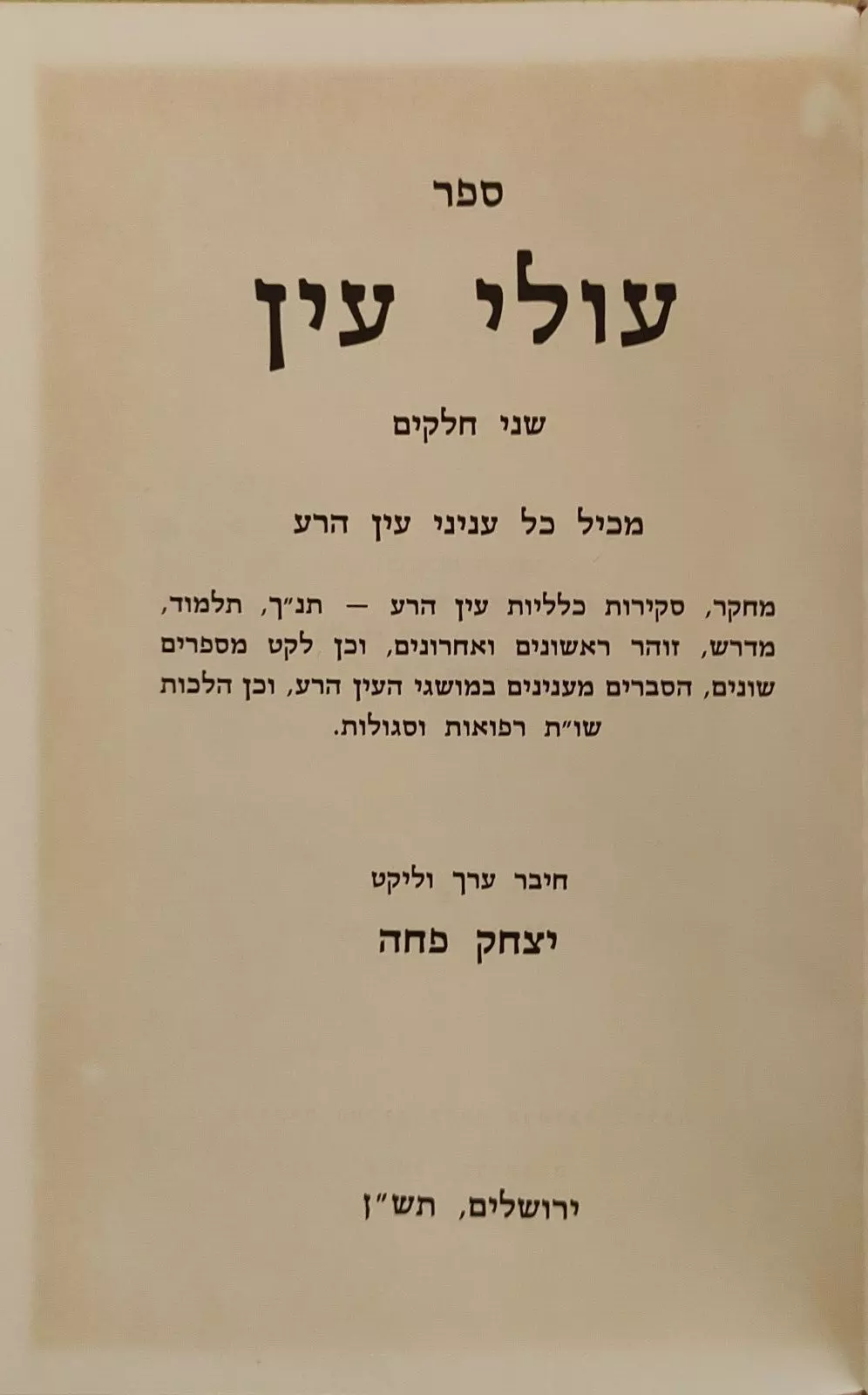 ספר עולי עין: מכיל כל עניני עין הרע המכון לחקר הרפואה בהלכה, 1989 – 260 עמודים